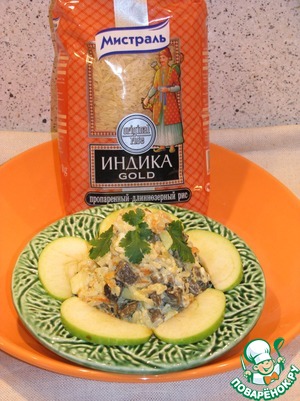 Для приготовления этого салата нам понадобится: Печень говяжья или куриная, рис пропаренный длиннозерный Индика Gold от ТМ "Мистраль", лук репчатый, морковь, небольшие зеленые яблоки.