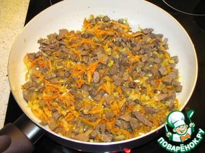 Добавить печень, соль перец и еще немного обжарить, помешивая.