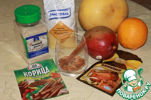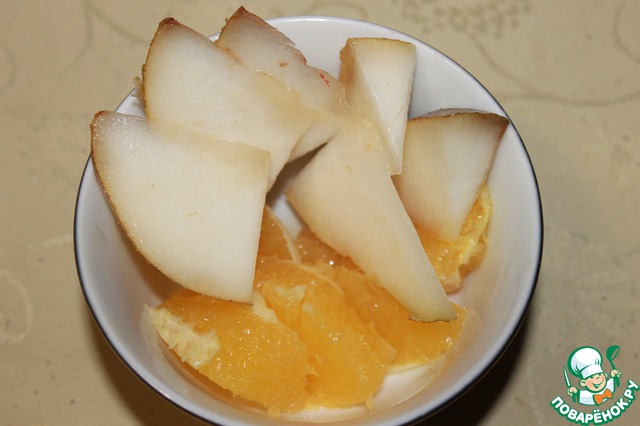 • Цитрусовые чистим, вырезаем сегменты без пленок, режем грушу, манго дольками. Сок от цитрусов выливаем в кус-кус.