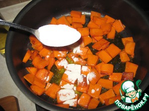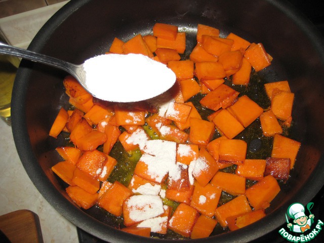 Когда одна сторона тыквы поджарится, добавьте одну столовую ложечку муки к ней, перемешайте и дайте поджариться еще немного (минутки две-три).
