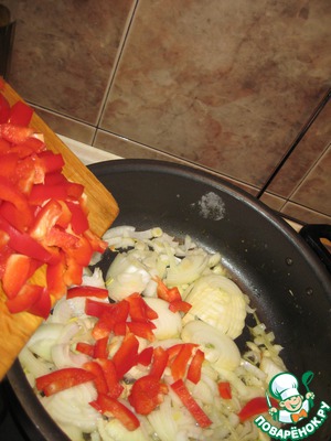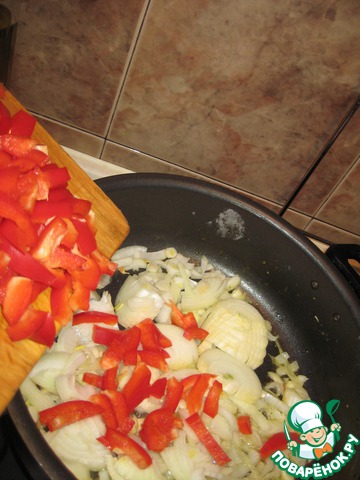 Лук нарезаем полукольцами и кидаем на разогретую с двумя столовыми ложками растительного масла сковороду. Пока они у нас знакомятся, болгарский перчик нарезаем кубиками либо полосочками и добавляем также к луку.