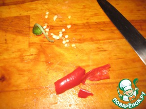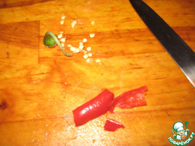 Так как сейчас у меня период увлечения перцами, предлагаю и Вам добавить немного чили на сковородку. Держим еще минуты три, выключаем огонь под сковородой.
