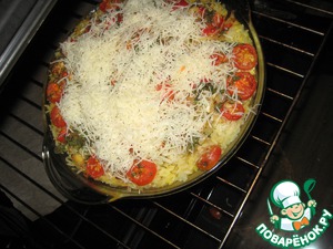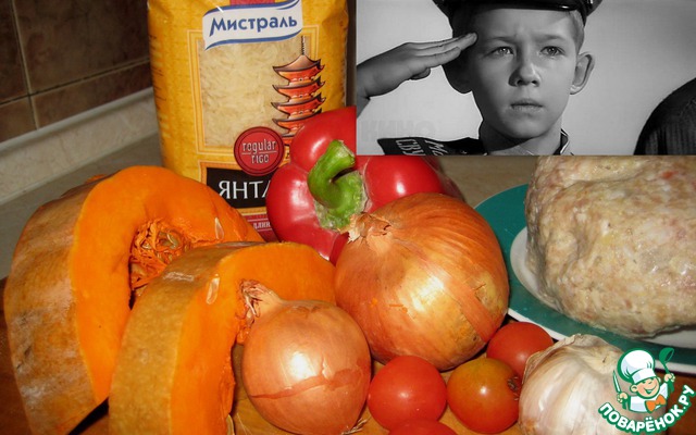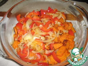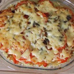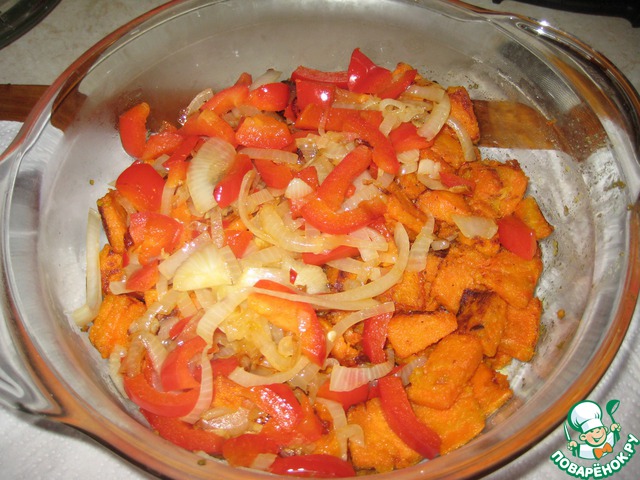 На слой тыквы в форме выкладываем половину луково-перечной смеси. На нее - фарш (либо мясо), еще 1/4 часть луково-перечной смеси, рис. На рис - остатки смеси, помидорки черри половинками, либо помидорки кружочками.