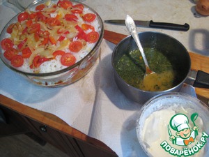В рисовый бульон добавляем нарезанную зелень (у меня сегодня сушеная), сметану, соль, перец, приправы (у меня сегодня паприка, аджика, куркума), раздавленный чеснок. Поливаем нашим соусом все слои.
