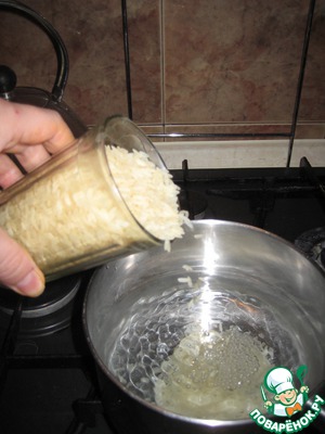 В холодную воду засыпаем рис и отвариваем до полуготовности. Бульон от риса затем сливаем в определенную емкость - он нам еще понадобится.
