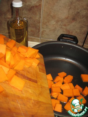 Тыкву нарезаем кубиками (когда нет тыквы, я готовлю это блюдо с кабачками - безумно вкусно!!!). На сковородке ее уже ждут две столовые ложки растительного масла, которые уже буквально закипели от долгого ожидания.
