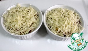 И посыпаем тертым сыром. Сыр можно брать любой по вашему вкусу. Я использовала смесь мацарелла и пармезан.