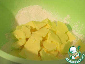В муку добавить разрыхлитель и просеять. Затем добавить мягкого сливочного масла и ванилин. Перетереть.