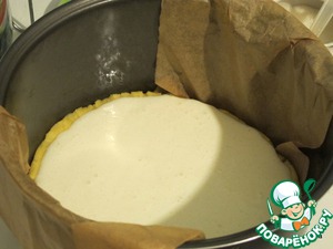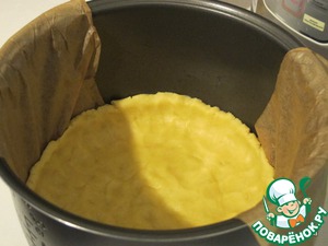 Дно и бока чаши смазать маслом, уложить пекарскую бумагу (чтобы потом было удобно извлечь пирог) и распределить тесто, делая высокие борта.