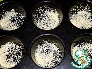 Ячейки формы слегка смазать маслом и присыпать кунжутом.