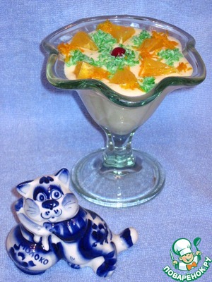 Разложим десерт по креманкам, добавив кусочки апельсина. Украсим сверху кокосовой стружкой. Поставим на час в холодильник.