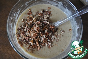 Просеиваем муку, корицу, разрыхлитель и добавляем грецкие орехи (немного измельченные).
