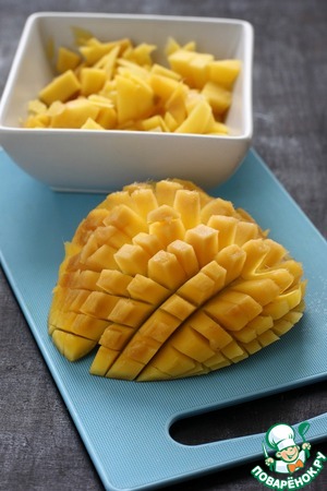 Итак, манго помыть, разрезать наполовину, удалить косточку и, не прорезая кожуру насквозь, нарезать на небольшие квадраты. Вывернуть мякоть наружу и срезать ее ножом. Сложить кубики манго в небольшую посуду. -