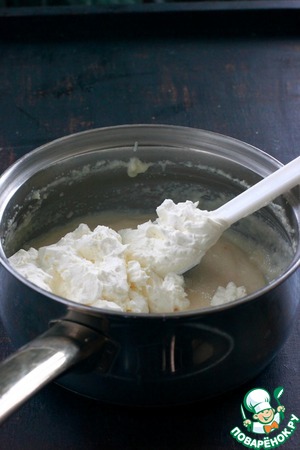 Готовим сливочную шапочку. В холодное молоко всыпать семолину, сахар, чуть подсолить и варить после закипания молока, помешивая, 2 минуты. Поставить остывать. За это время каша еще немного загустеет и станет по консистенции похожей на густую рыночную сметану.