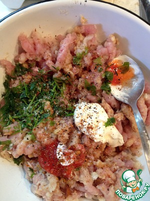 В фарш добавить сметану, кетчуп, нарезанную петрушку, яйцо, соль, перец, специи по вкусу.