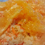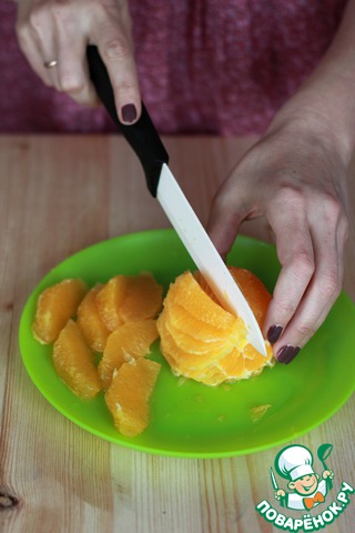 Начните приготовление салата с разделки апельсина на филе. Смысл данной операции - вырезать апельсиновую мякоть между белыми пленками. Делайте это над мисочкой, чтобы собрать вытекающий сок. Из остатков апельсина отожмите сок, добавьте к нему тот сок, который появился после извлечения филе. У меня получилось около 30 мл. Вполне достаточно, чтобы замариновать морковь. Если сока получилось больше, придется увеличивать количество сахара и специй и уменьшать количество воды, иначе кускус будет пресный и мокрый. Но об этом позже.