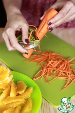 Морковь нарежьте как можно более тонкой соломкой. Я воспользовалась пилером для чистки овощей со специальной насадкой. Терка для корейской моркови тоже подойдет.