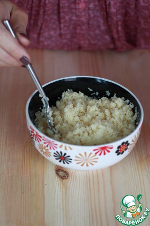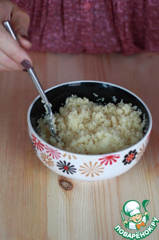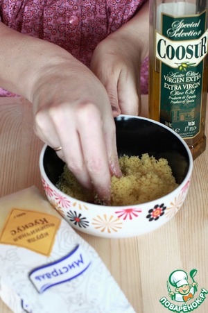 Кускус высыпать в глубокую посуду, добавить ложку оливкового масла и втереть его в крупу. Готовый кускус после такой обработки будет более рассыпчатый.