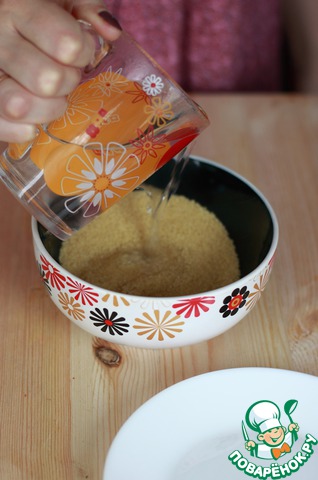 На 100 гр кускуса нужно 200 мл кипятка. Но мы будем в кускус добавлять еще морковь вместе с соком, в котором она вымачивалась, поэтому уменьшите количество кипятка на 30 мл (количество цитрусового сока). Итак, залейте кускус кипятком, накройте тарелкой и оставьте на 4 минуты упревать.