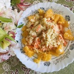 Выложите кускус горкой на блюдо и украсьте подготовленными филированными дольками апельсина и мятой.