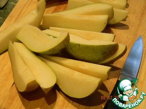 Груши моем, режем на 4 части, удаляем сердцевину и делим на дольки.