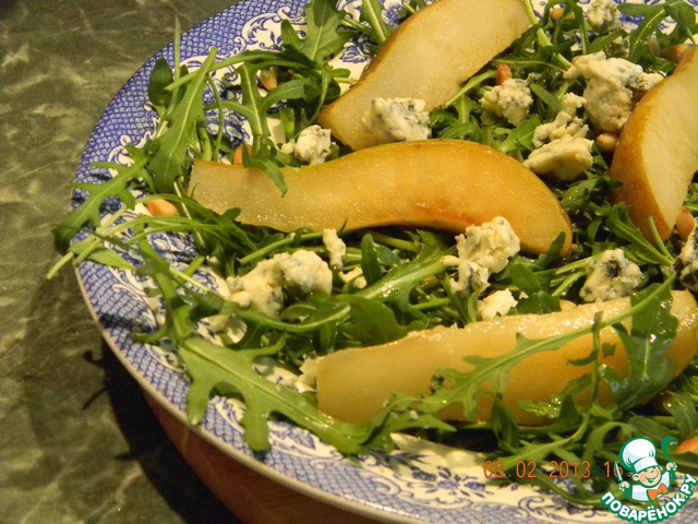 Салат из рукколы с грушей и сыром Дорблю. По моему мнению, очень легкий, праздничный и не приевшийся салатик. Рецепт взят из интернета.