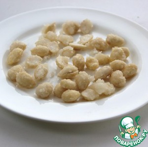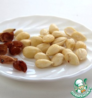 Горсть миндаля залить горячей водой на 2 мин и очистить от шкурки.