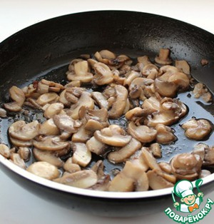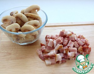 Нарезать кубиками бекон и шампиньоны. Грибы у меня были замороженные и нарезанные.