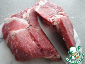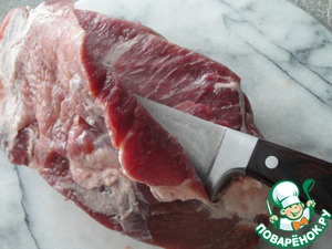 Для начала нам нужно разрезать мясо. Для этого нам понадобится острый нож, ну и само мясо, которое нужно с верхней стороны, справа налево горизонтально, толщиной примерно 1,5 см. надрезать, но не до конца. Первая страница книги открыта.
