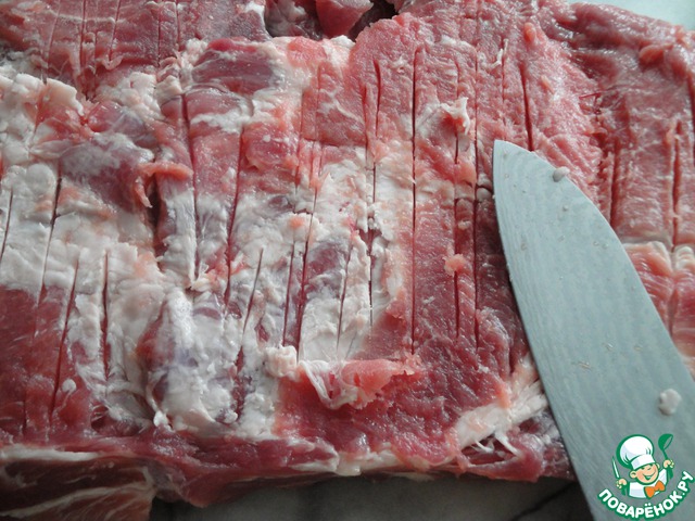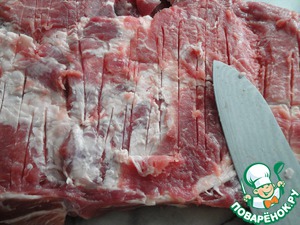 Теперь проделаем то же самое, только слева направо. Если мясо получилось не совсем одинаковой толщины, то отбейте его немного.
