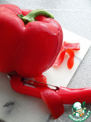 Перец можно почистить, а можно и запечь в духовке и потом шкурку обтянуть. Разрезать пополам.
