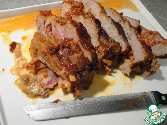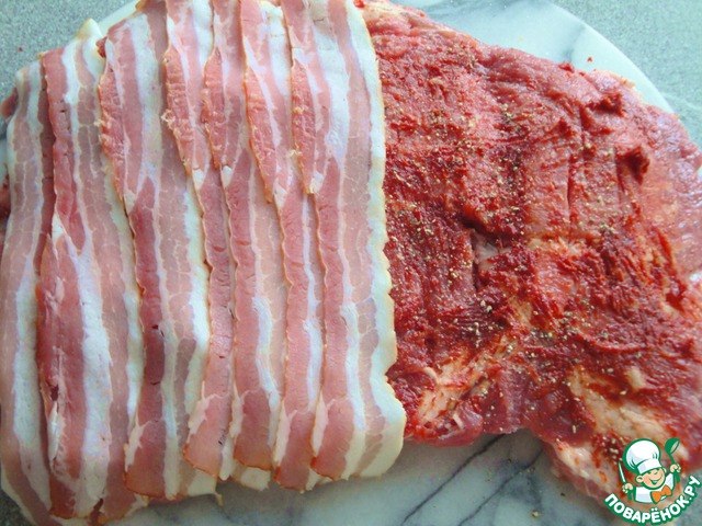 Мясо смазать томатной пастой. Посолить, поперчить и, если хотите, посыпать красной паприкой. Затем выложить бекон.