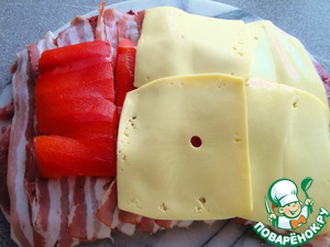 Теперь кусочки перца и сыр. Мясо свернуть рулетом и закрепить, чтобы не распадался.
