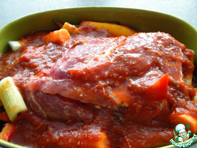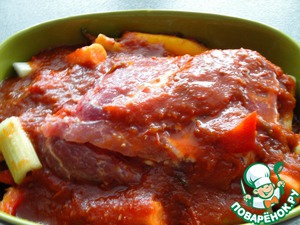 Морковь, лук-порей и сельдерей нарезать на крупные кусочки и положить также в форму. Залить все томатным соусом.