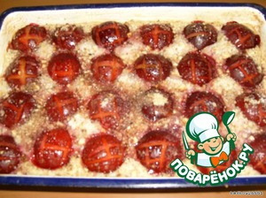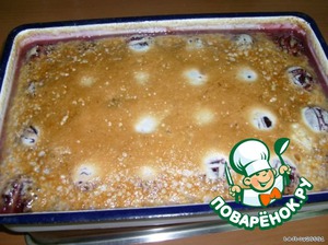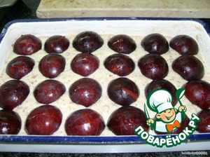 Выливаем наше тесто и разравниваем, сливы желательно помыть порезать пополам и отделить косточки, выкладываем сливы в форму, сделав сверху пару надрезов, и каждую присыпаем сахаром.