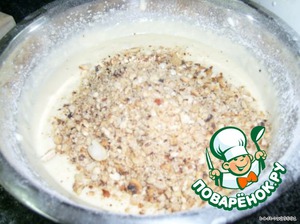 В миске взбиваем яйца, сахар, соль, сметану и масло, добавляем муку и измельченные орехи.
