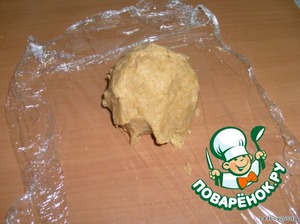 Смешиваем с маслом, должен получится вот такой песочный шарик, завернём его в пленку и положим отдохнуть в морозилку на полчасика.