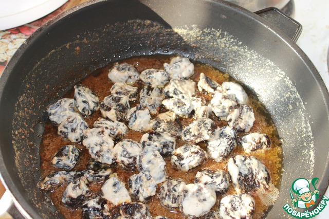 Смешиваем 1.5 ст. л. сахарной пудры с коньяком и сливками, заливаем чернослив и убираем настаиваться на 1.5 часа.