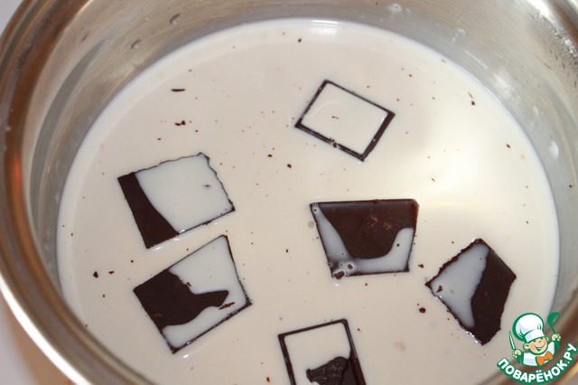 Из оставшихся сливок делаем шоколадную глазурь, нагрев их в кастрюльке с шоколадом до полного его растворения.