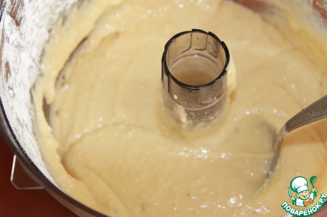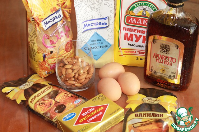 Размягченное сливочное масло 110г взбиваем со 100г сахара (в тесто можно взять обычный сахар) до растворения крупинок, не останавливая блендера, вводим по одному яйцу, ванилин, миндальную муку, чуть соли, всыпаем Амаретто, муку, разрыхлитель и семолину, все хорошо взбиваем.