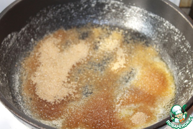 На сковороде со съемной ручкой топим сливочное масло 40г, крутим сковороду, чтоб масло растеклось на стенки, высыпаем 110г коричневого сахара. Ждем, когда начнет карамелизоваться.