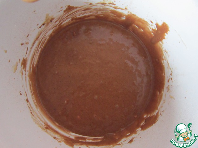 Приготовим тесто. 3 яйца взбить, постепенно добавляя сахар, до пышной белой массы. Добавляем муку, какао, ванилин и соду. Замешиваем тесто.