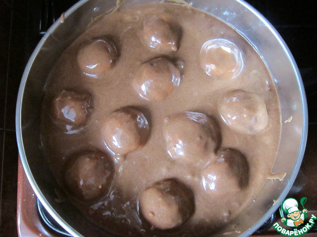 Заливаем шарики шоколадным тестом и отправляем в духовку, разогретую до 200-230 градусах, на 30-60 минут. Пирог перед подачей посыпать сахарной пудрой.