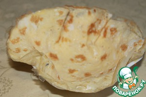 Переворачиваем наш мешочек на блюдо, разрезаем накрест верхушку и открываем лепестки