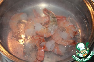 Креветки кидаем на 2 минуты в кипящую подсоленую воду, охлаждаем и мелко режем