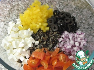 3. Болгарский перец и лук нарезать мелкими кубиками, помидоры черри -дольками, оливки - колечками.