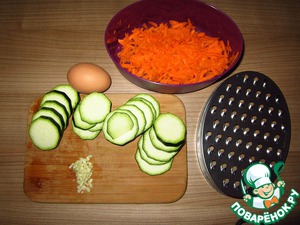 Морковь трём на крупной тёрке. Цуккини режем кружочками. Чеснок мелко режем.