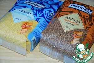 • Для приготовления каши берём гречневую крупу и пшено от "Мистраль".