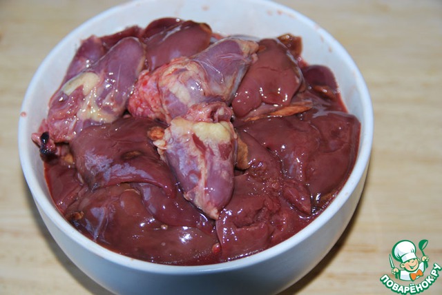 • Одновременно берём куриные сердечки и печень. В старинных рецептах брали не куриную, а говяжью печень. Субпродукты отваривали, на бульоне варили щи, а уже далее использовали отваренные печень и сердце для приготовления каши. Морковь также использовали отваренную из бульона.