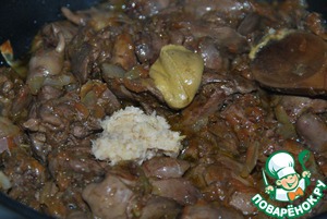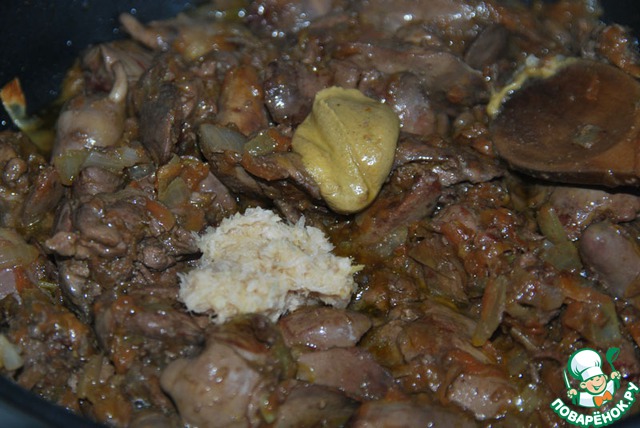 А ничего, что сердца должны жаритьтся/тушитьтся намного дольше чем куриная печень? Горчицу и хрен не надо туда класть, весь вкус испортишь!